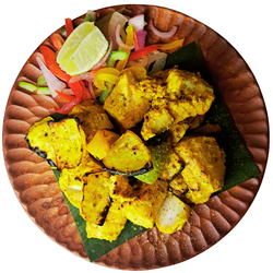 Paneer Tikka (GF) (Traditional Paneer Tikka / Hariyali / Malai) Handcrafted cottage cheese cubes marinated in spiced hung yogurt, finished Hariyali with mint or Malai with cashew, tandoor-roasted.
