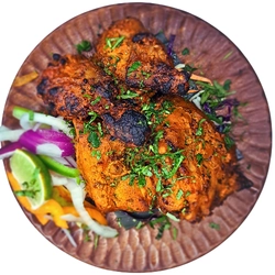 Tandoori Chicken (GF) Bone-in chicken leg and thigh marinated in spiced yogurt and garlic, slow-roasted to smoky perfection in the tandoor.